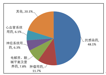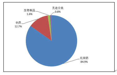 按照藥品類別統(tǒng)計(jì),化學(xué)藥品占86.6%,中藥占12.6%,生物制品占0.8%。化學(xué)藥品排名居前的藥品類別是抗感染藥、心血管系統(tǒng)用藥、腫瘤用藥、神經(jīng)系統(tǒng)用藥、電解質(zhì)、酸堿平衡及營(yíng)養(yǎng)藥;中藥排名居前的藥品類別是理血?jiǎng)⒀a(bǔ)益劑、祛濕劑、開(kāi)竅劑、清熱劑。