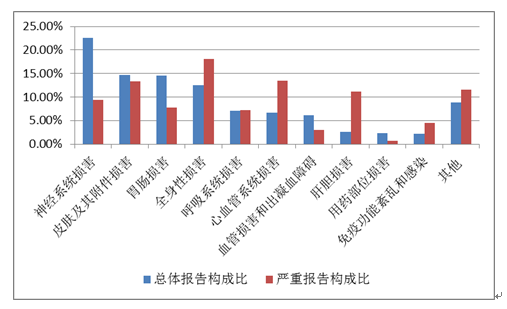 2019年注射劑不良反應(yīng)/事件報(bào)告中,累及器官系統(tǒng)排名前5位的是皮膚及其附件損害、胃腸損害、全身性損害、神經(jīng)系統(tǒng)損害、心血管系統(tǒng)損害。注射劑嚴(yán)重不良反應(yīng)/事件中,累及器官系統(tǒng)排名前5位的是皮膚及其附件損害、全身性損害、血液系統(tǒng)損害、胃腸損害、呼吸系統(tǒng)損害(圖14)。